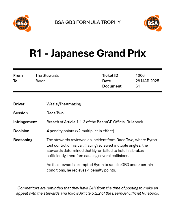 | 2025-10-28 | OW | 25 S1 W1 GB3 | DNF |