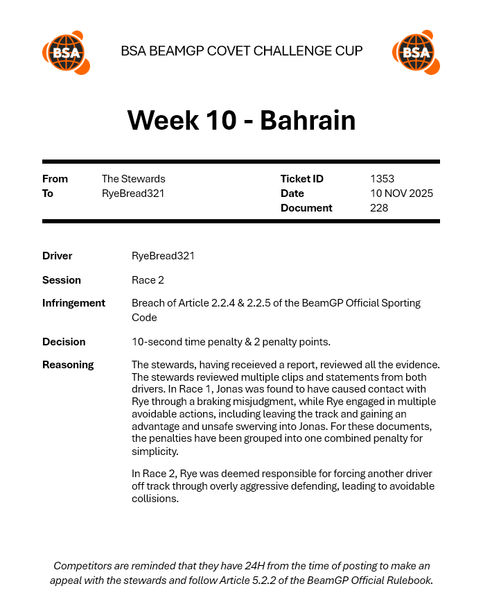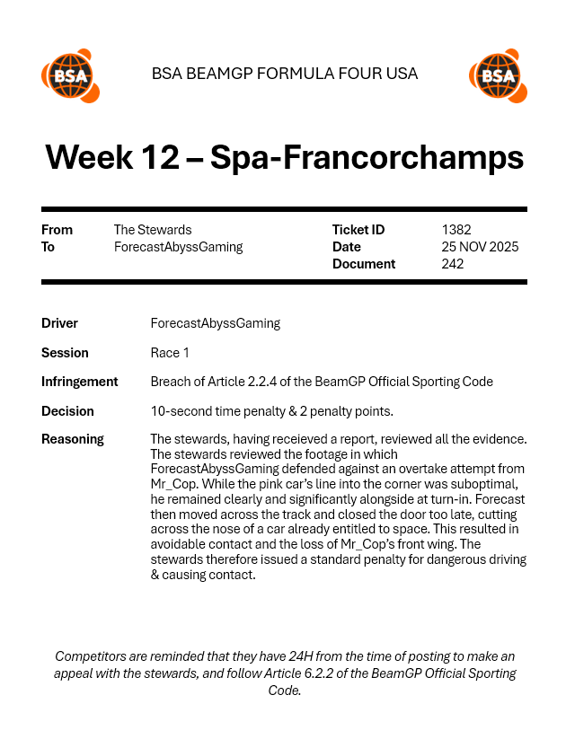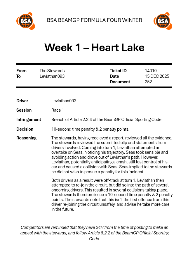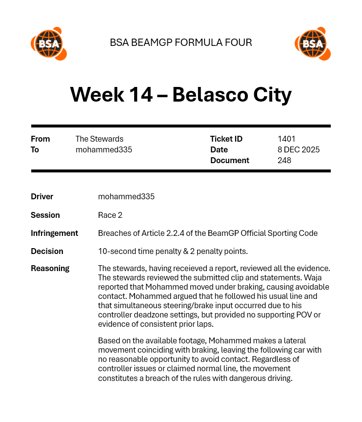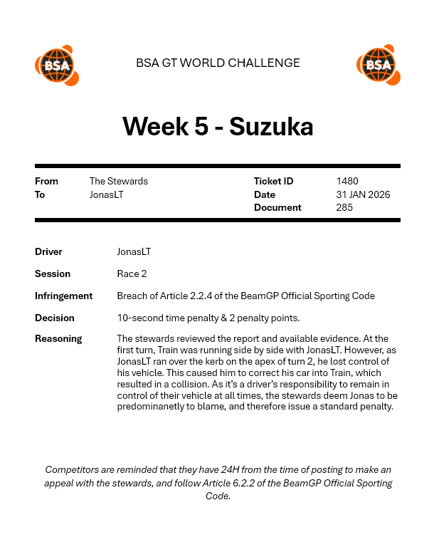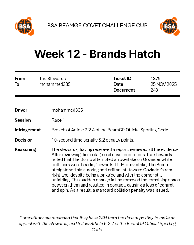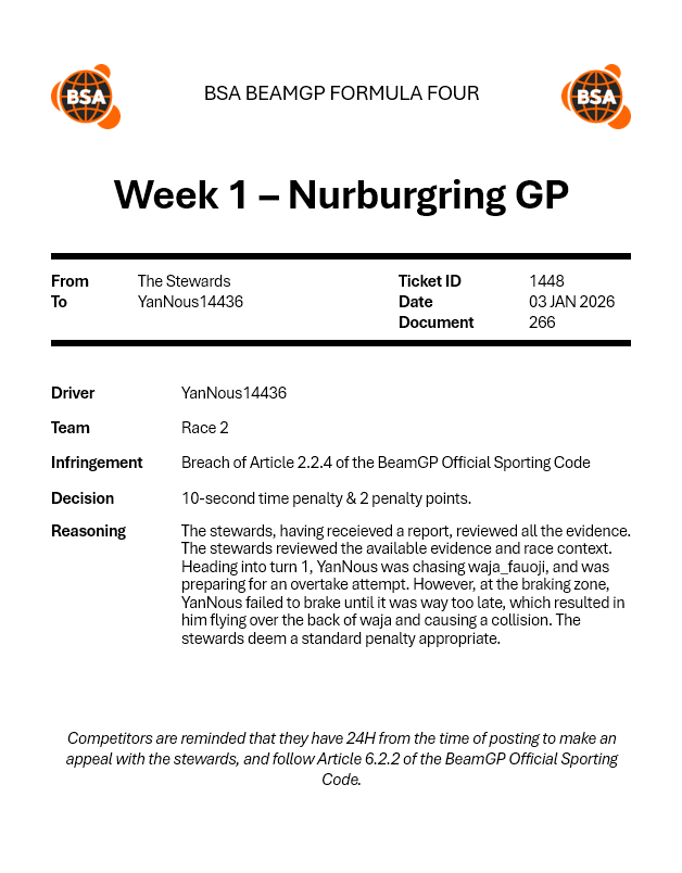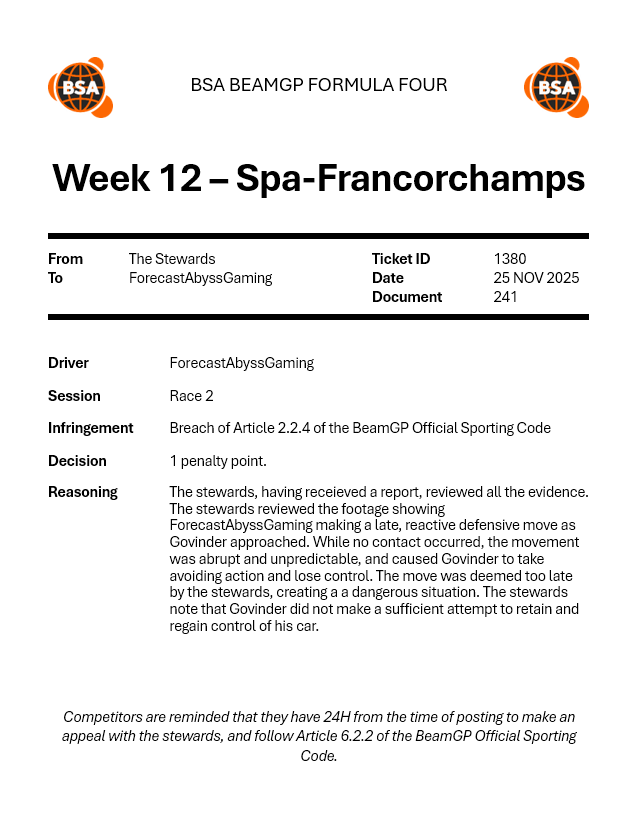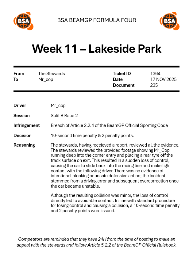 Breach of Article 2.2.5 // 10-second time penalty & 2 penalty points.