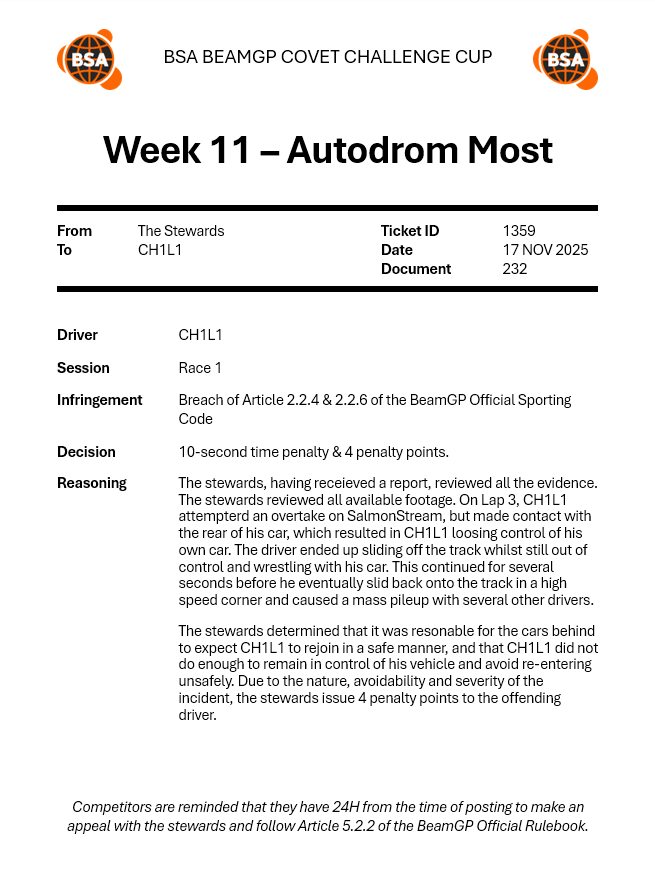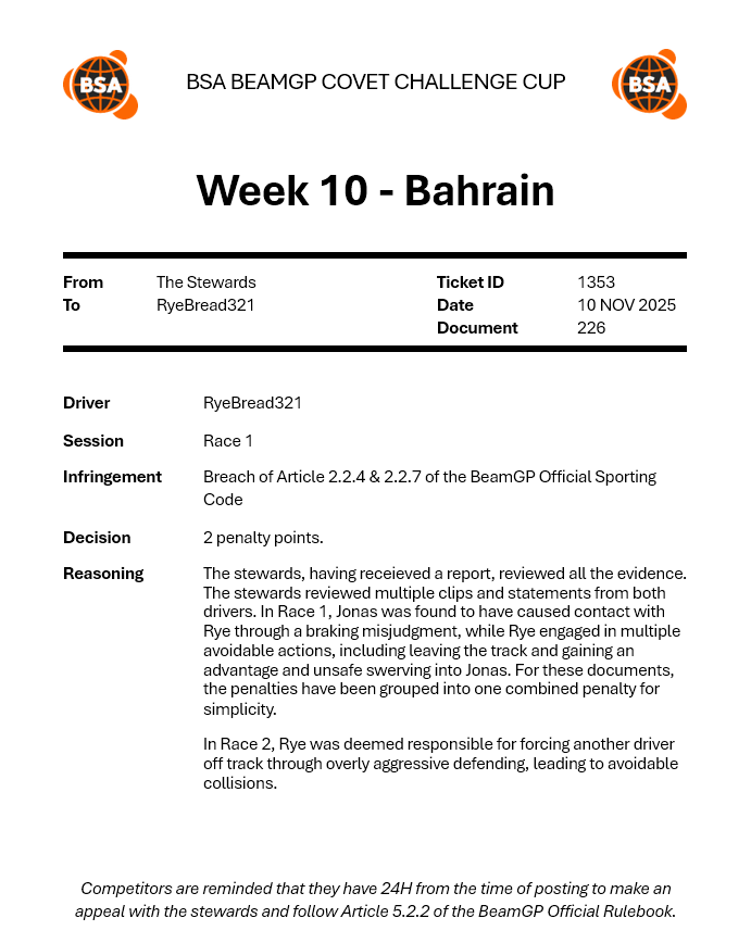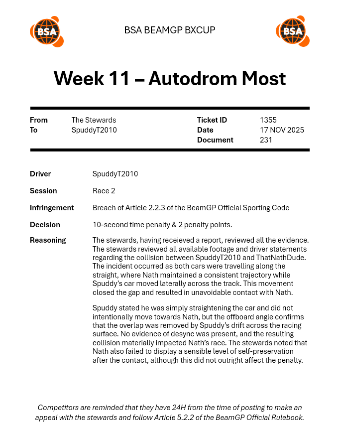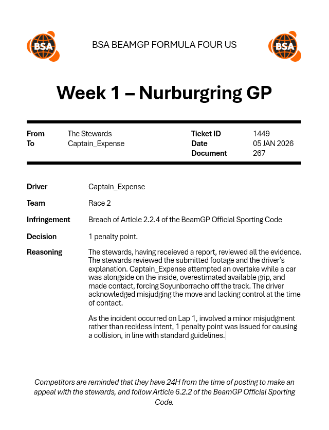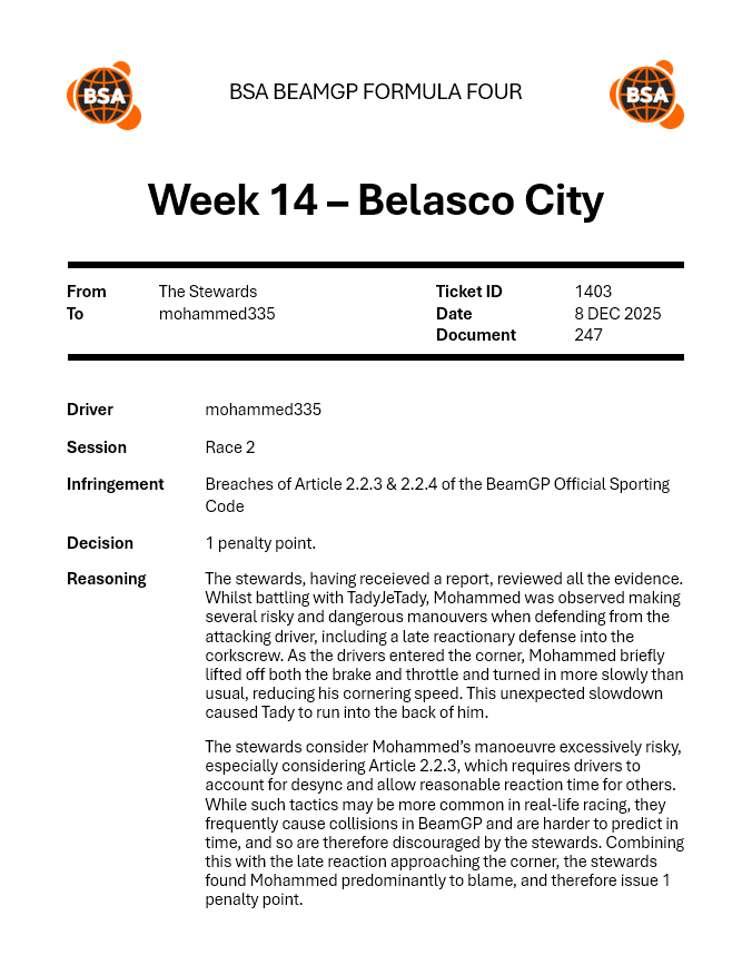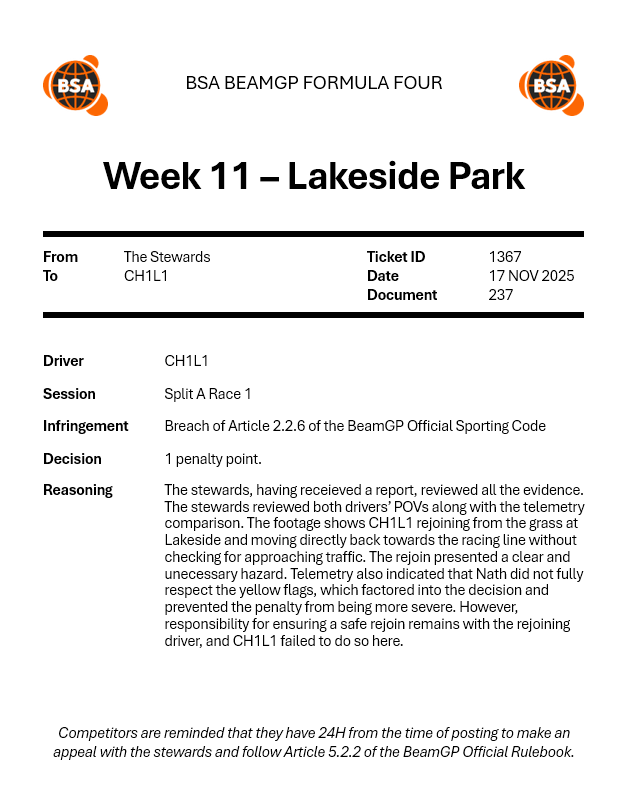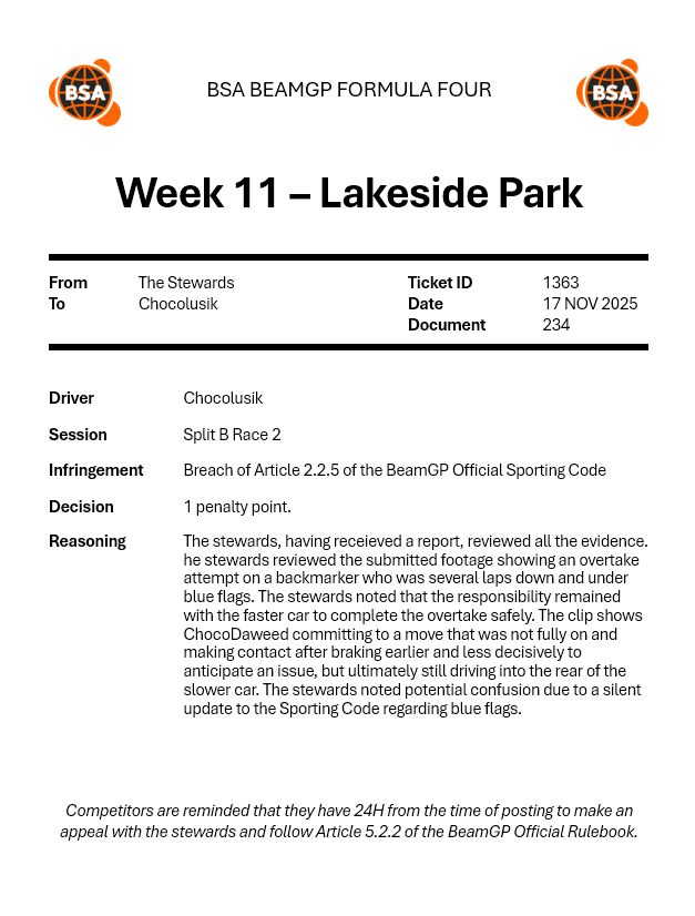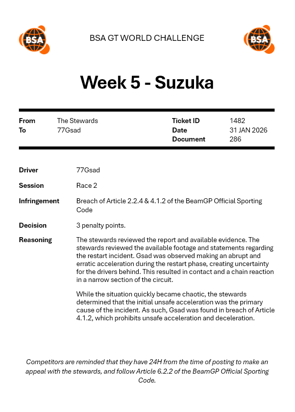 Breach of Article 2.2.5 // 10-second time penalty & 2 penalty points.