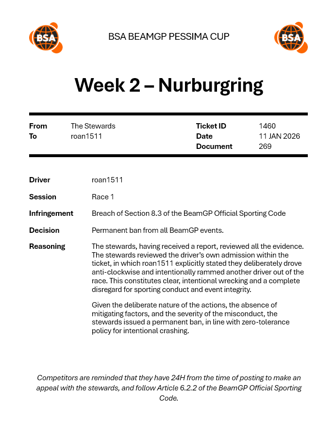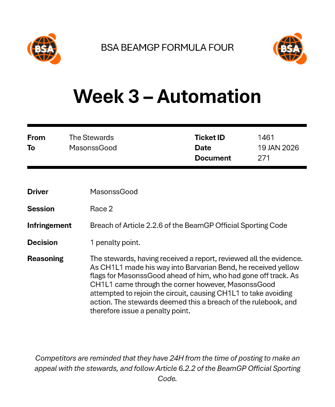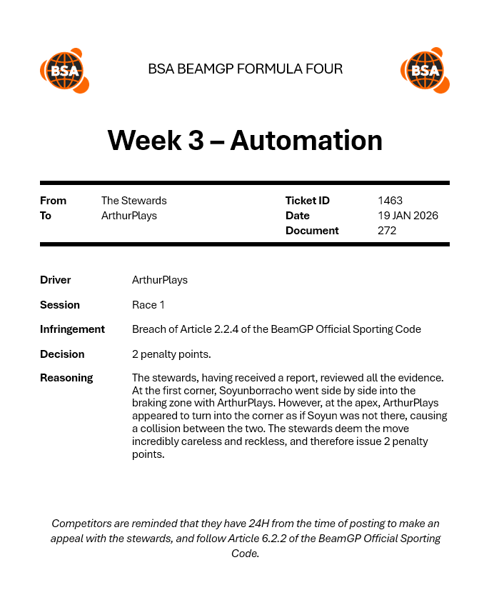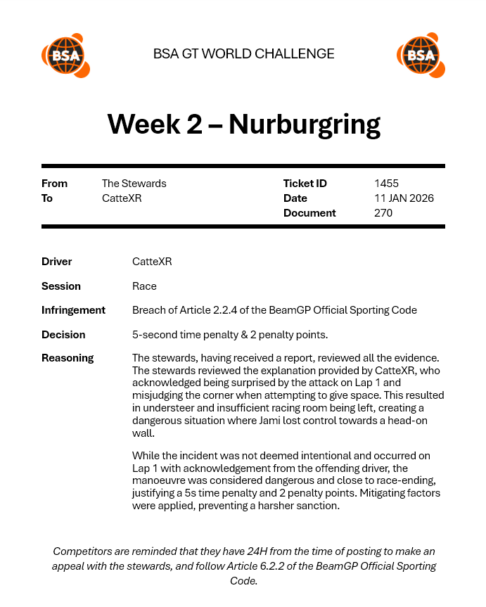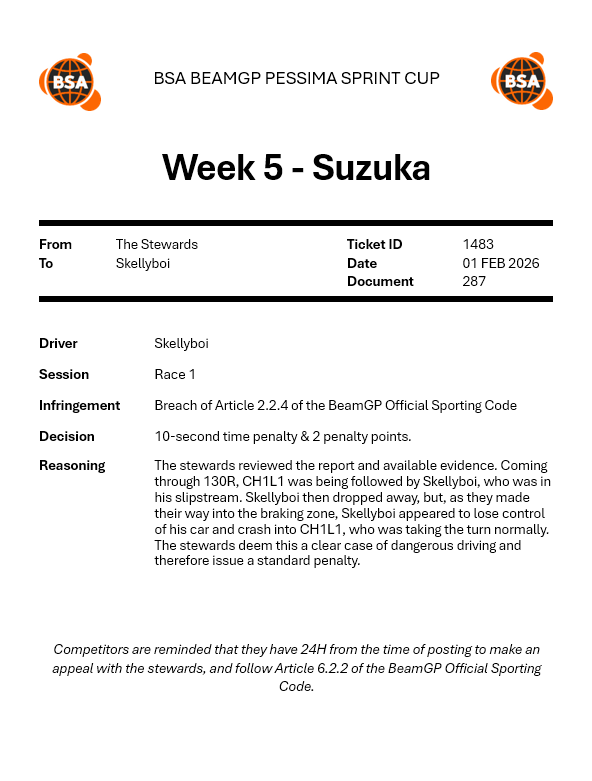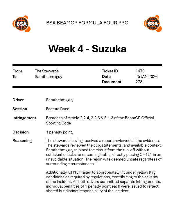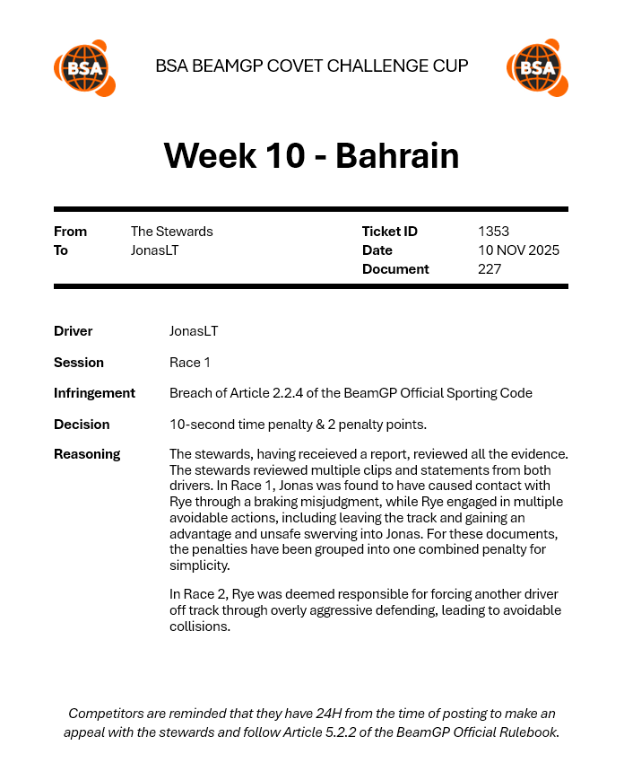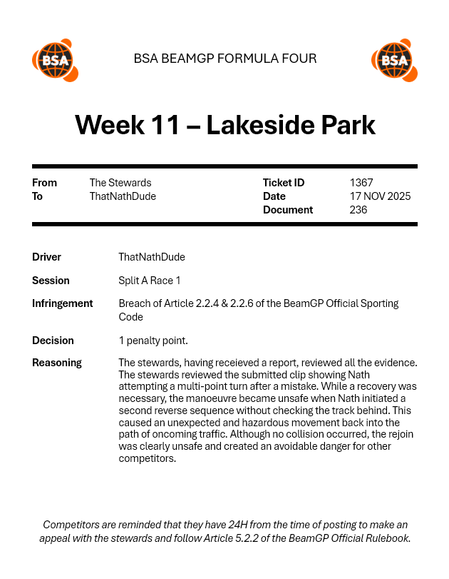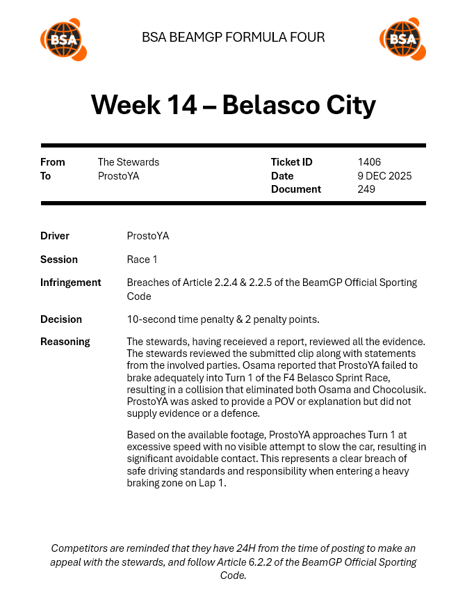 Breach of Article 2.2.5 // 10-second time penalty & 2 penalty points.